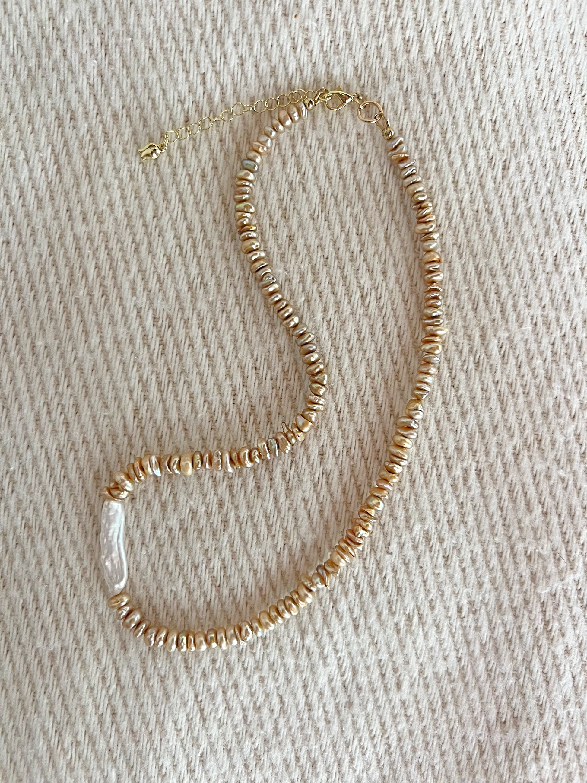Champagne Chip Pearls & Off Center Flat Pearl Necklace