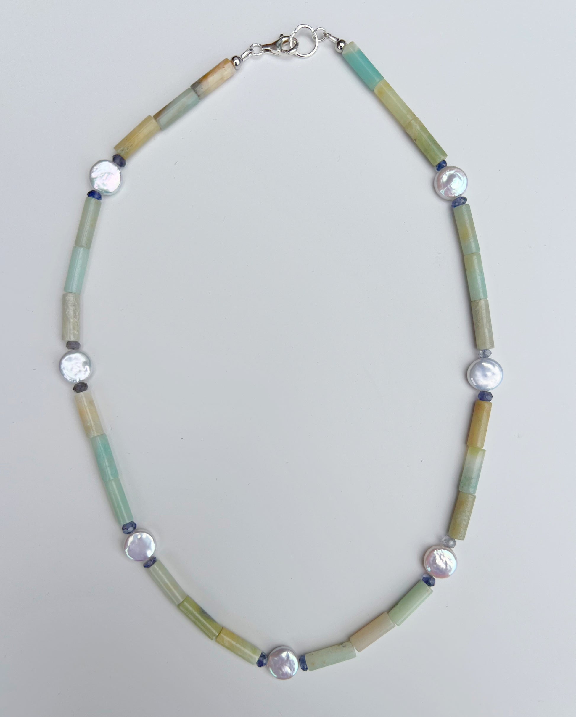 Multicolored Cylinder Beads with Blue Crystal & Freshwater Coin Pearl. Finished with Sterling Silver Lobster Clasp.